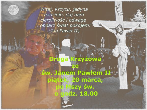 Papieska Droga Krzyżowa w piątek po Mszy św. odprawianej o godzinie 18 (około godziny 18.30). Rozpoczęcie w kościele parafialnym, zakończenie na placu szkolnym przy Figurze św. Jana Pawła II. Bardzo proszę druhów strażaków o kierowanie ruchem drogowym.